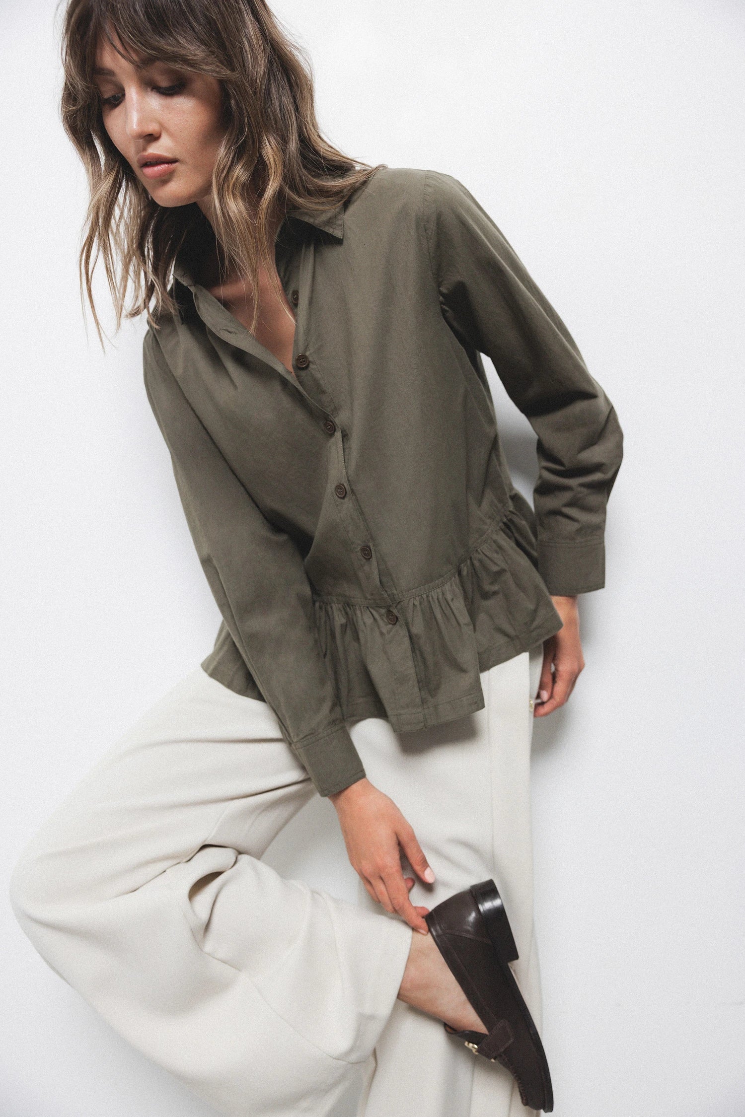 Camisa com pormenores florais bordados nas costas. Acabamento em folhos. Mangas compridas com punhos abotoados.