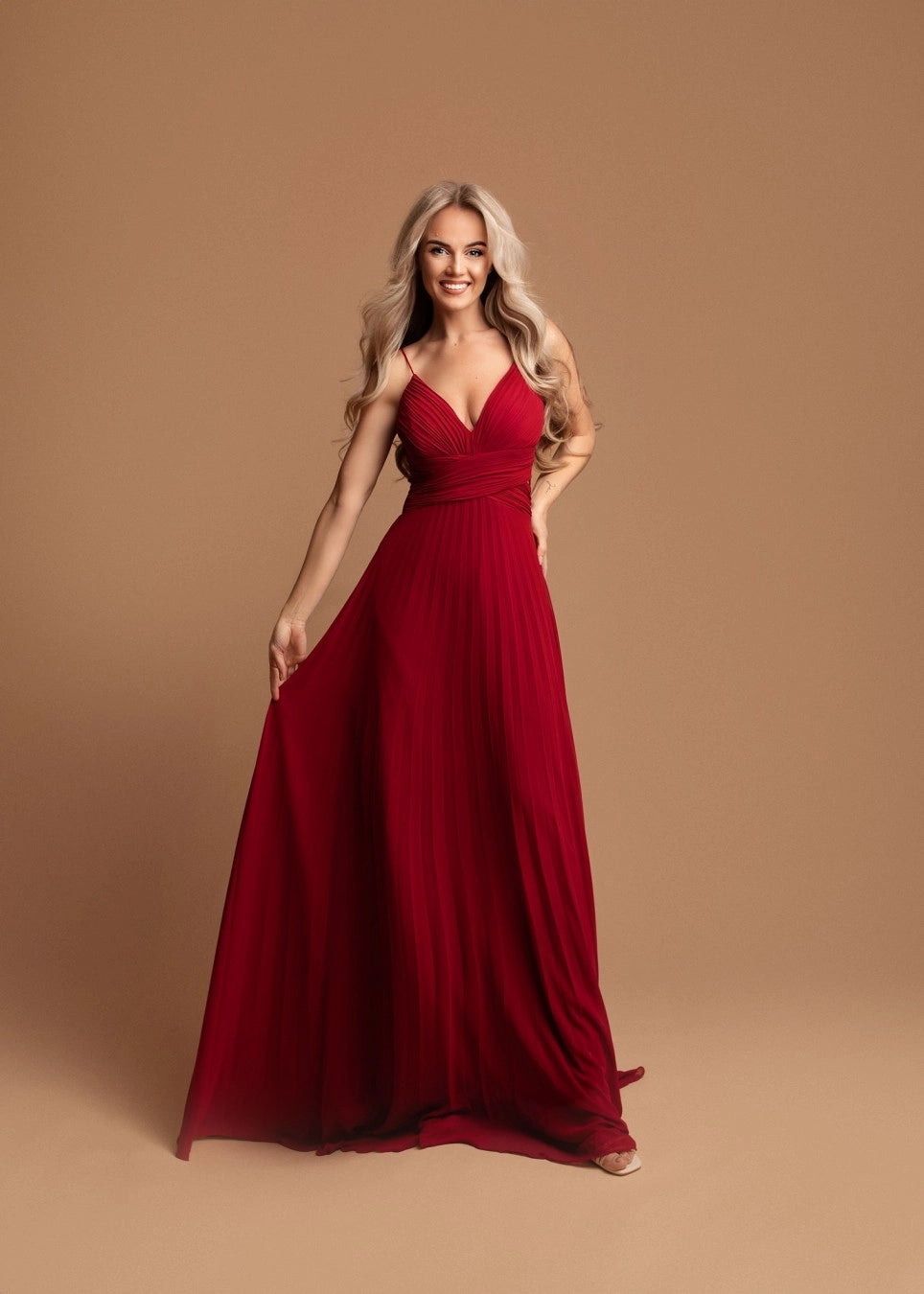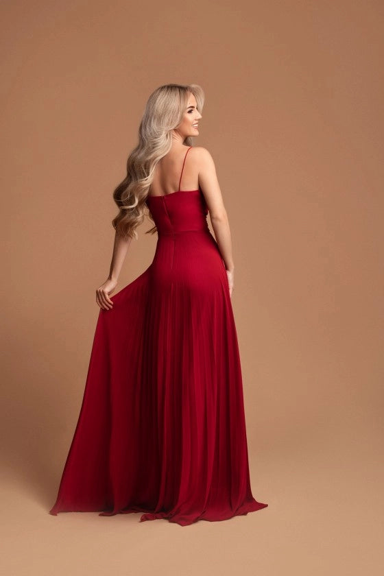 A cintura marcada com um delicado drapeado valoriza a forma do corpo, enquanto a saia plissada longa confere leveza e movimento, tornando-o ideal para casamentos, eventos formais e ocasiões especiais. O tom verde profundo adiciona um toque de requinte e exclusividade à peça.